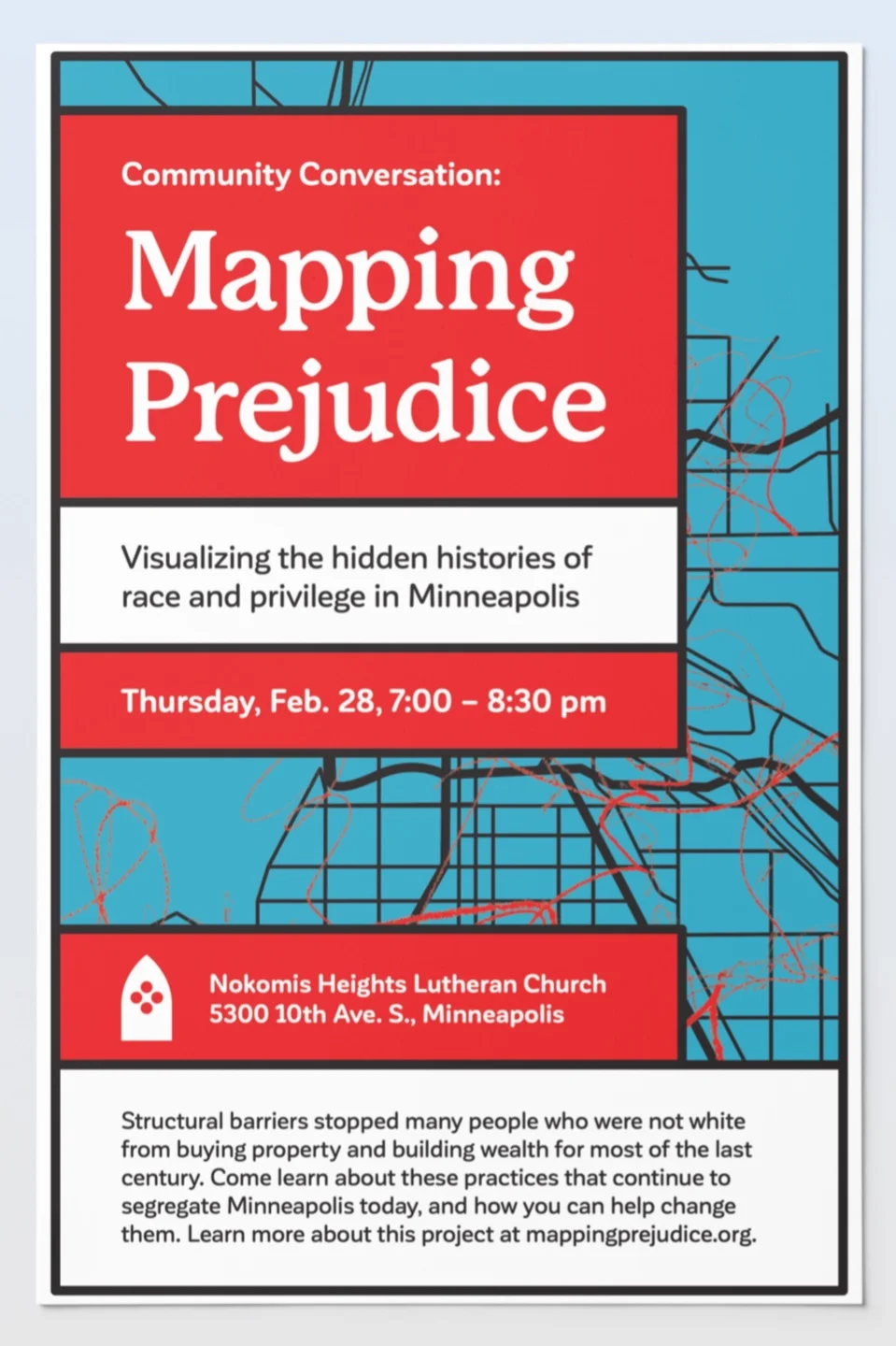 My church is hosting a session about redlining and the role it played in the segregation of Minneapolis, both in the past and its continued effect on the present. I love being part of a community that seeks to address inequalities and educate the wider community about our role in breaking down systemic oppression. I was more than happy to provide design assistance to help advertise this event.
